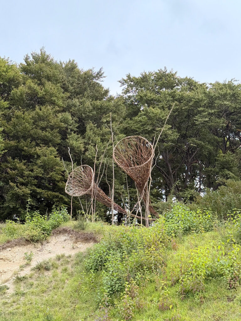 Mit zarte Klängen, wie aus Weltentiefen, verwebt Larissa Israel v. Trotha Skulptur und Natur zu einem sinnlichen Erlebnisraum. Wie ein geheimnisvolles Wesen windet sich die Installation von Frank Nordiek durch die Tiefe bis in die Offenheit der Natur.