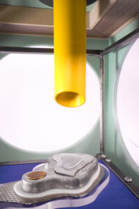 Benedikt Flückiger entwickelt seit 2024 die Serie PSM (Potential Space Models): kubische Raummodelle (36×36×36 cm), die zwischen Architektur, Filmkulisse und Maschinenassoziation changieren. Sie knüpfen an Guckkästen des 18./19. Jh. als frühe Massenmedien an und machen den Kubus zum Medium der Reflexion. Entscheidend ist die Herkunft der Materialien: aus Rückbauten, Schrottplätzen, teils riskant geborgen. Die Werke thematisieren Recycling, Materialbiografien und Nachhaltigkeit und verknüpfen utopische Raumvisionen mit einer ökologisch-performativen Praxis.