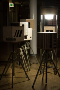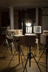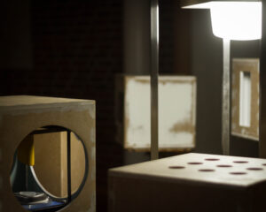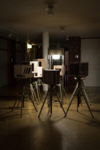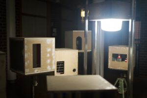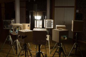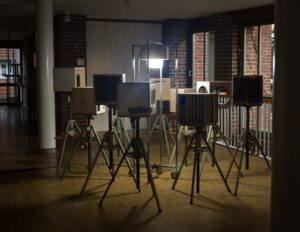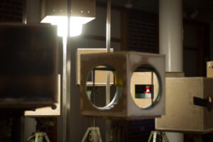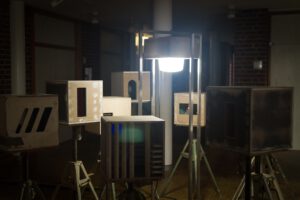 Benedikt Flückiger entwickelt seit 2024 die Serie PSM (Potential Space Models): kubische Raummodelle (36×36×36 cm), die zwischen Architektur, Filmkulisse und Maschinenassoziation changieren. Sie knüpfen an Guckkästen des 18./19. Jh. als frühe Massenmedien an und machen den Kubus zum Medium der Reflexion. Entscheidend ist die Herkunft der Materialien: aus Rückbauten, Schrottplätzen, teils riskant geborgen. Die Werke thematisieren Recycling, Materialbiografien und Nachhaltigkeit und verknüpfen utopische Raumvisionen mit einer ökologisch-performativen Praxis.